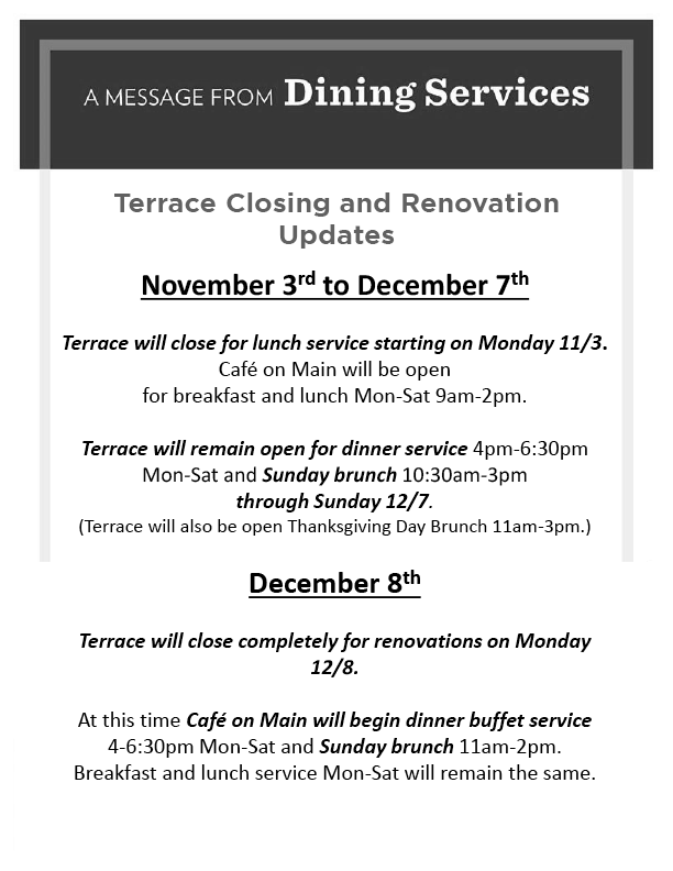 Terrace will remain open for dinner service 4pm-6:30pm Mon-Sat and Sunday brunch 10:30am-3pm through Sunday 12/7.
