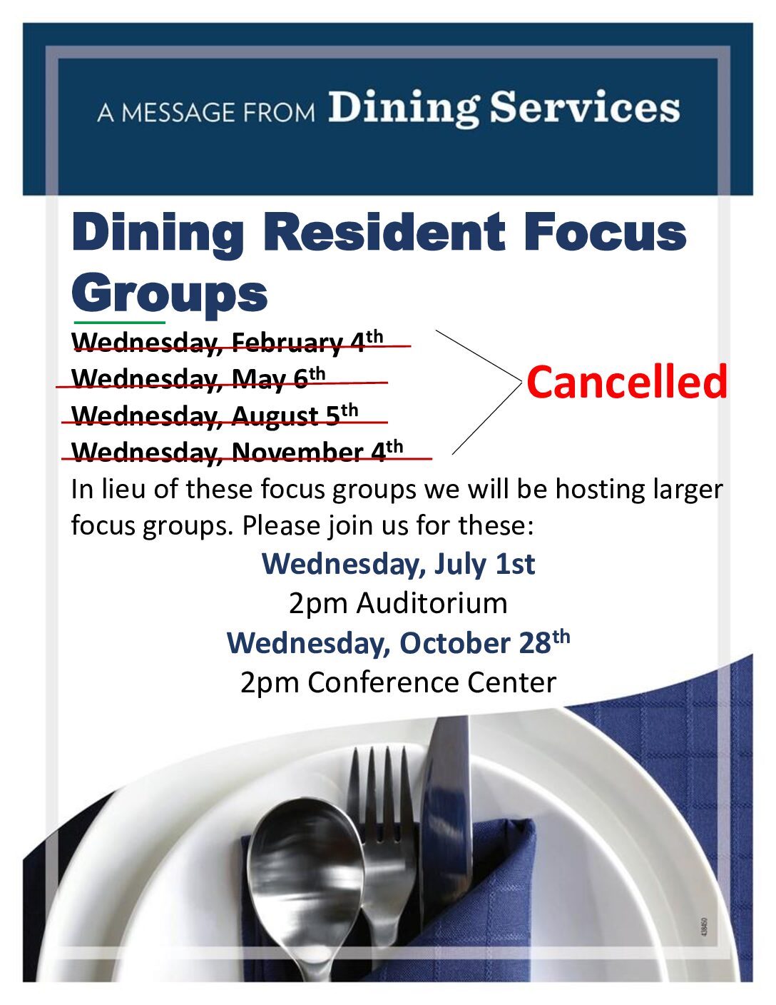 In lieu of the earlier scheduled focus groups we will be hosting larger focus groups. Please join us for these: