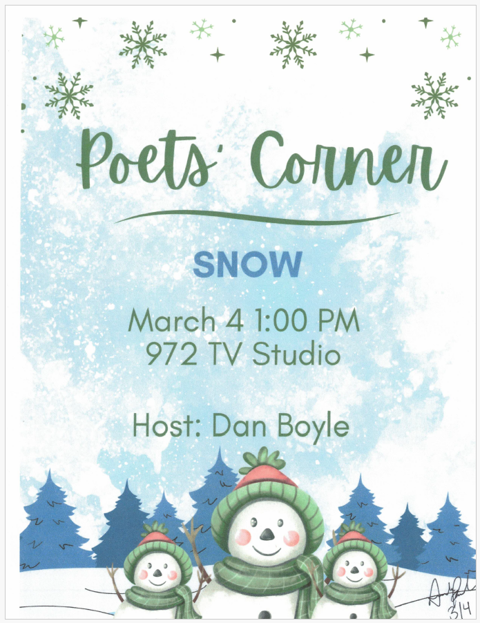 The Poets’ Corner tapes a monthly program of reading on Channel 972. The program is broadcast later to the Charlestown community. New readers are welcome to attend with their choice of favorite poems, even their own.