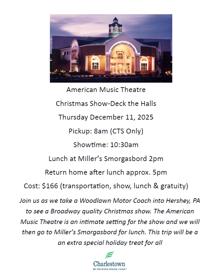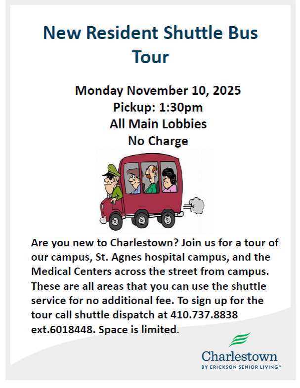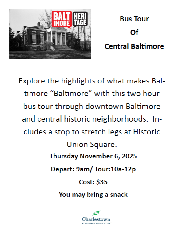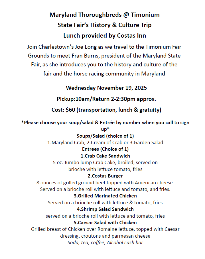 For further information on a trip or to reserve a space, call Dave Schuch in Transportation at 410.737.8838; ext.6018448.
